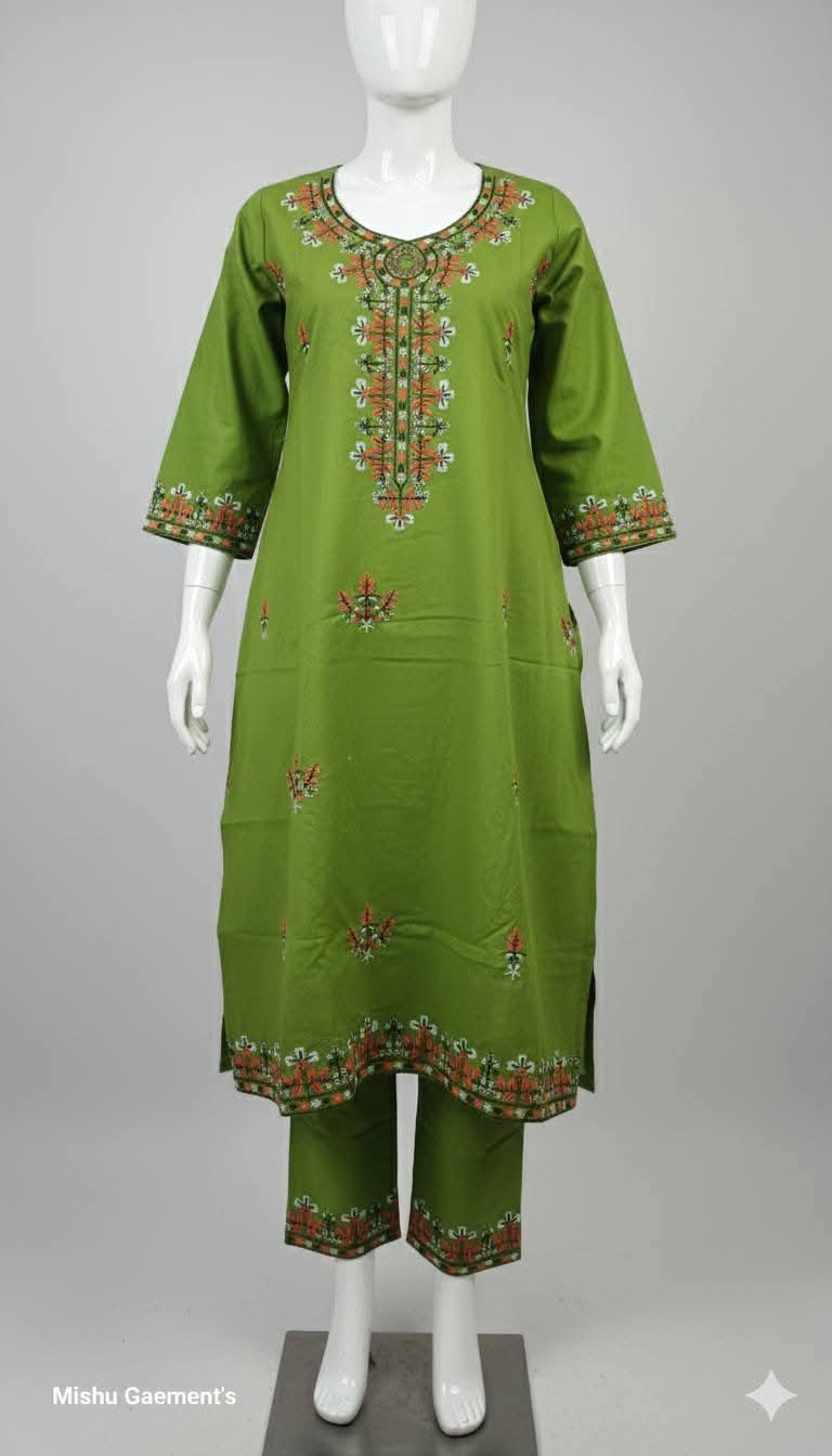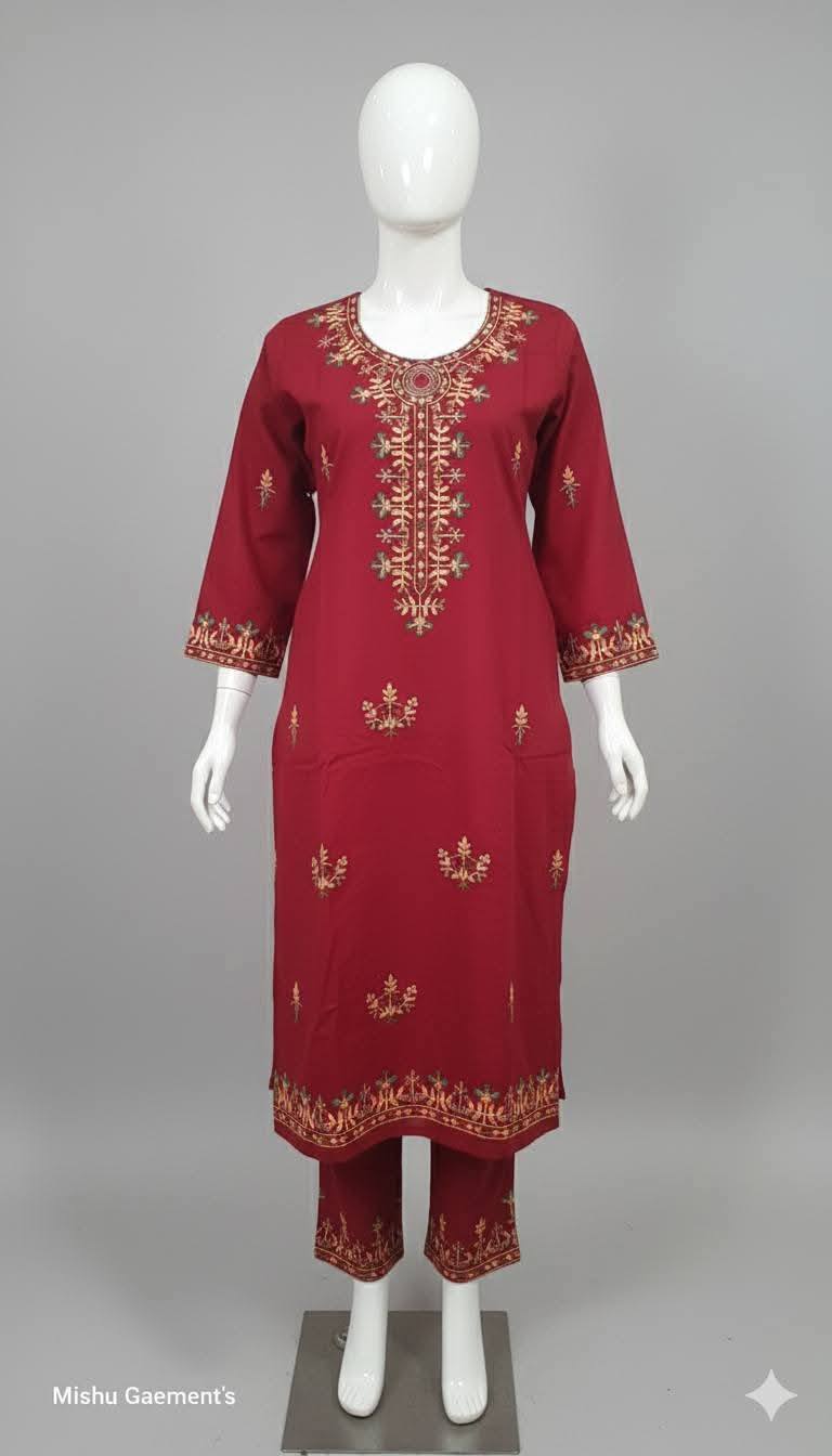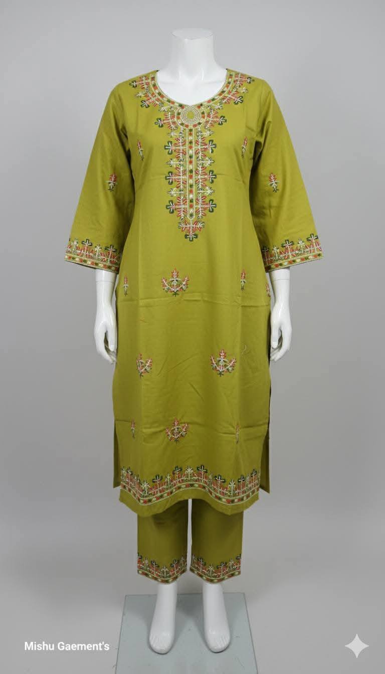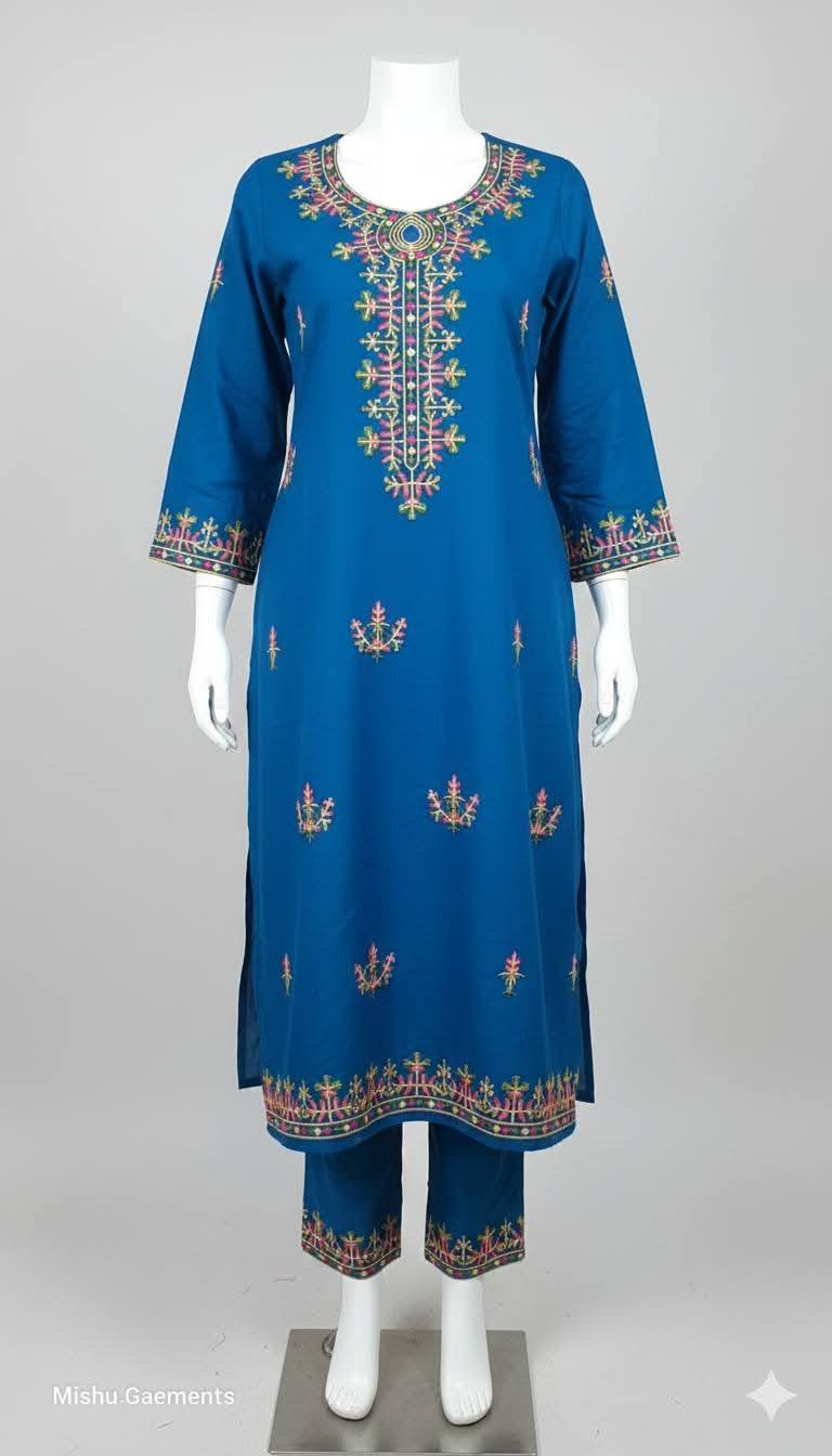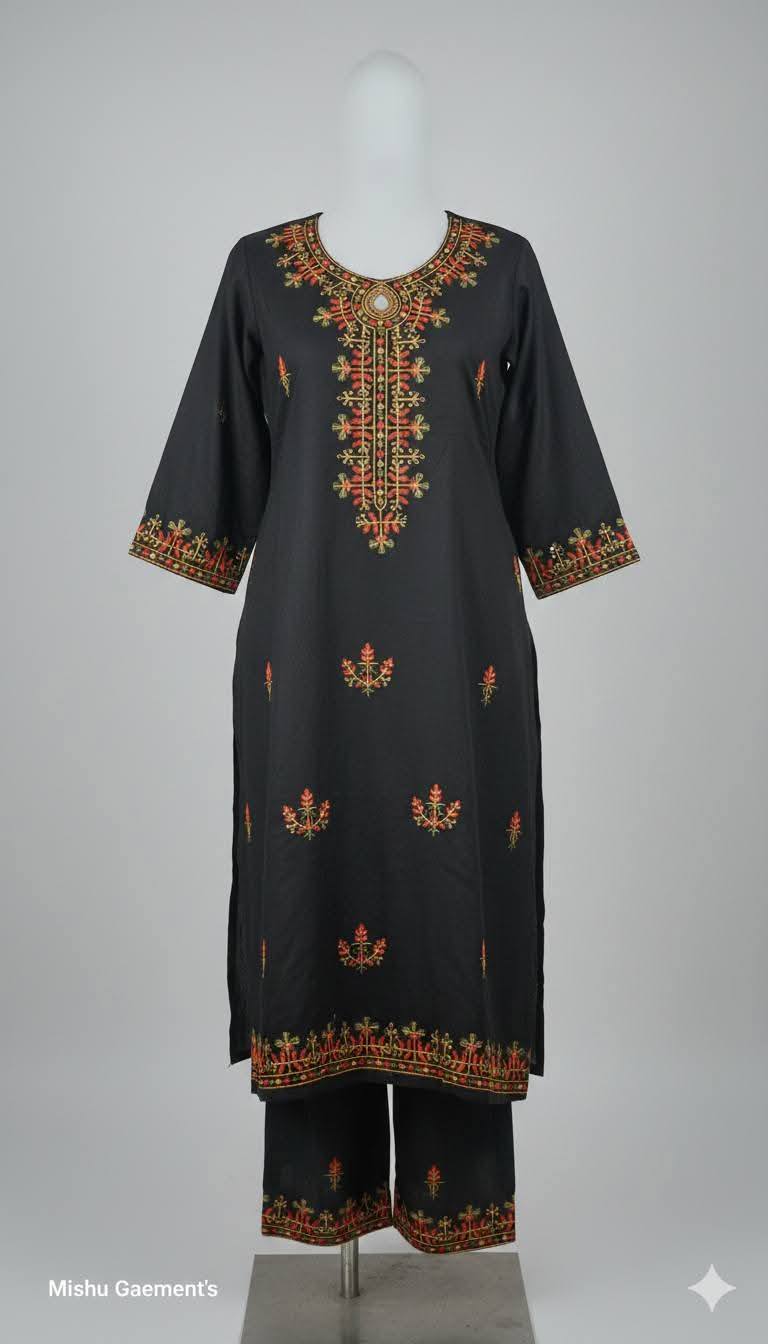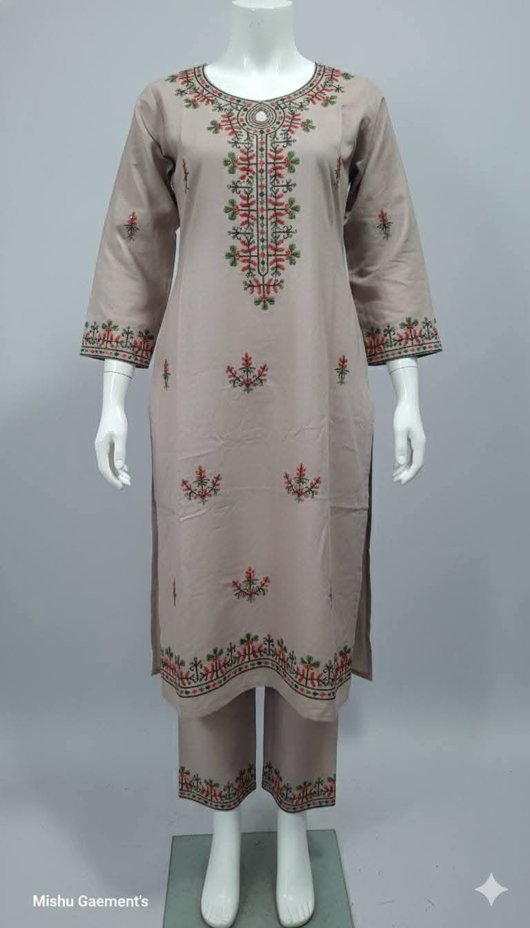 The kurti features delicate multicolor embroidery around the neckline, sleeves, and hem, giving it a classy and traditional look. Paired with a matching bottom, this co-ords set is perfect for daily wear, office use, casual outings, or small occasions.