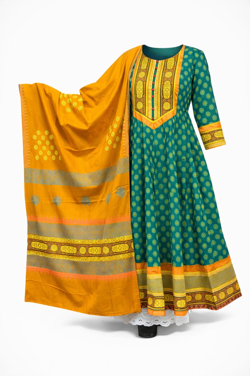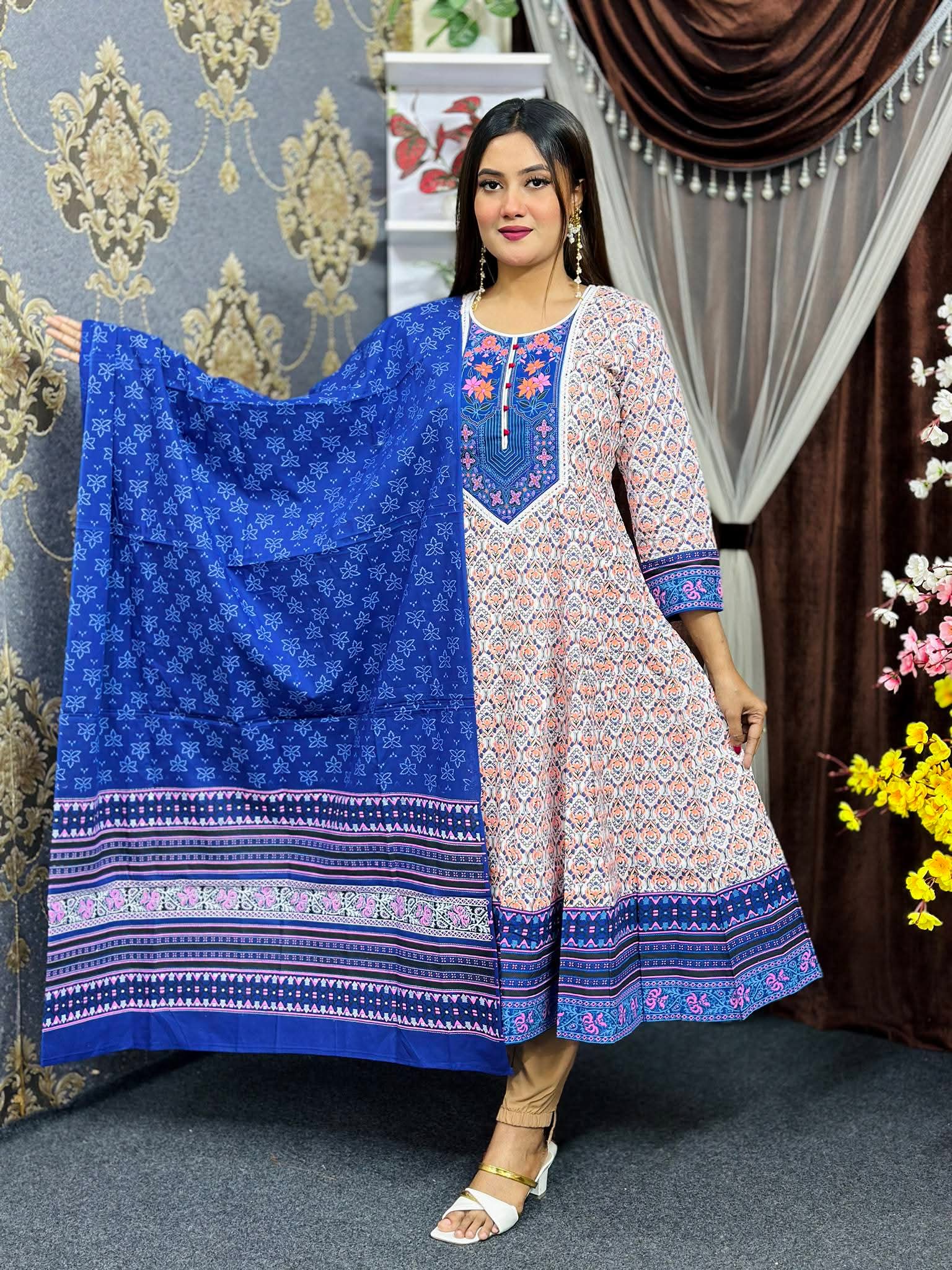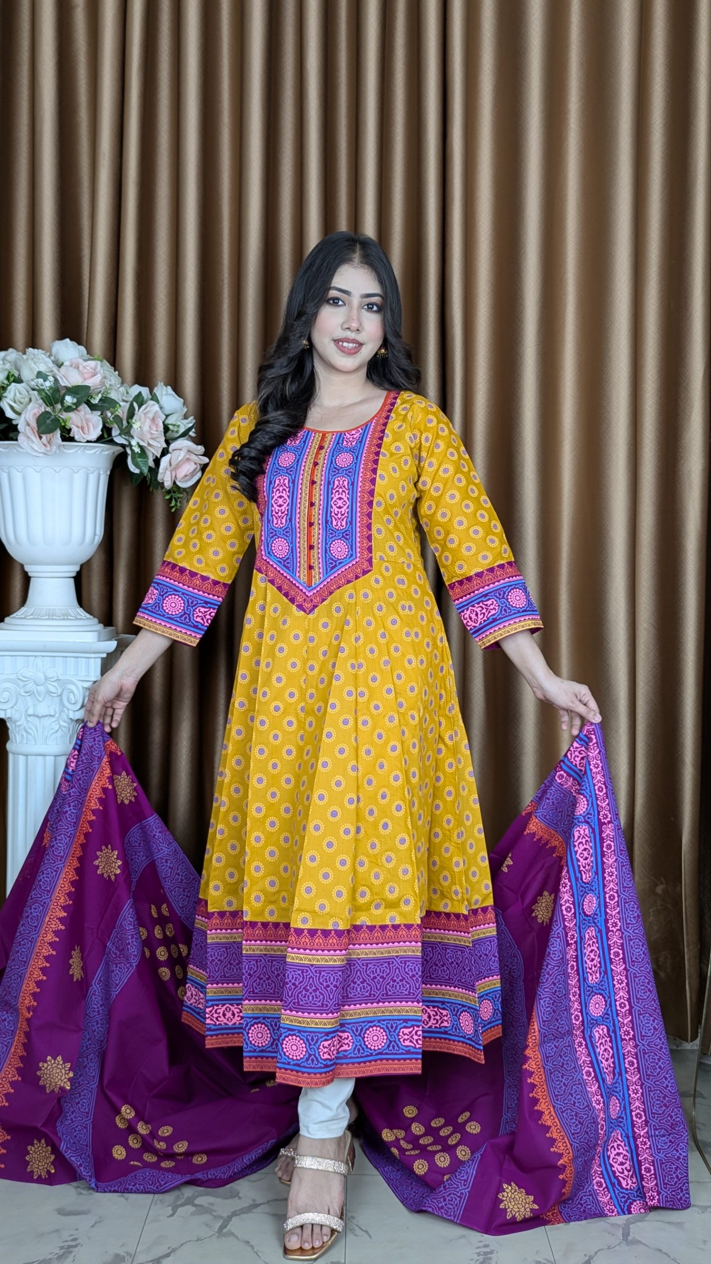 এলিগ্যান্ট ফ্লেয়ার কাট ও ট্র্যাডিশনাল মোটিফ ডিজাইন আপনাকে দেবে গ্রেসফুল ও স্মার্ট উপস্থিতি—ঈদের নামাজ, দাওয়াত বা ফ্যামিলি গেট-টুগেদারের জন্য দারুণ মানানসই।